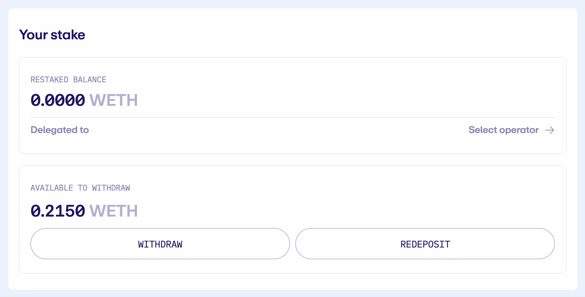 The "Redeposit" button is also available for the user to Restake funds in case the withdrawal was initiated by mistake.